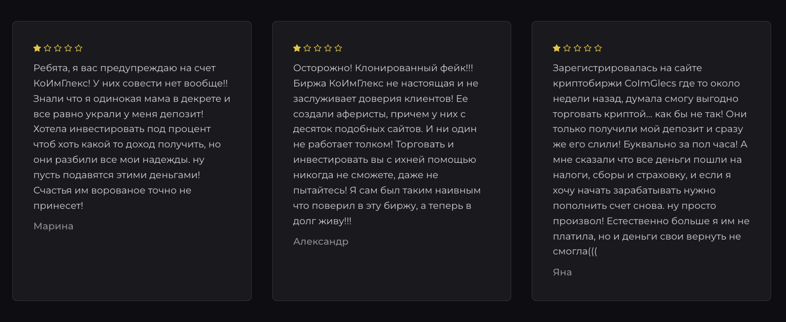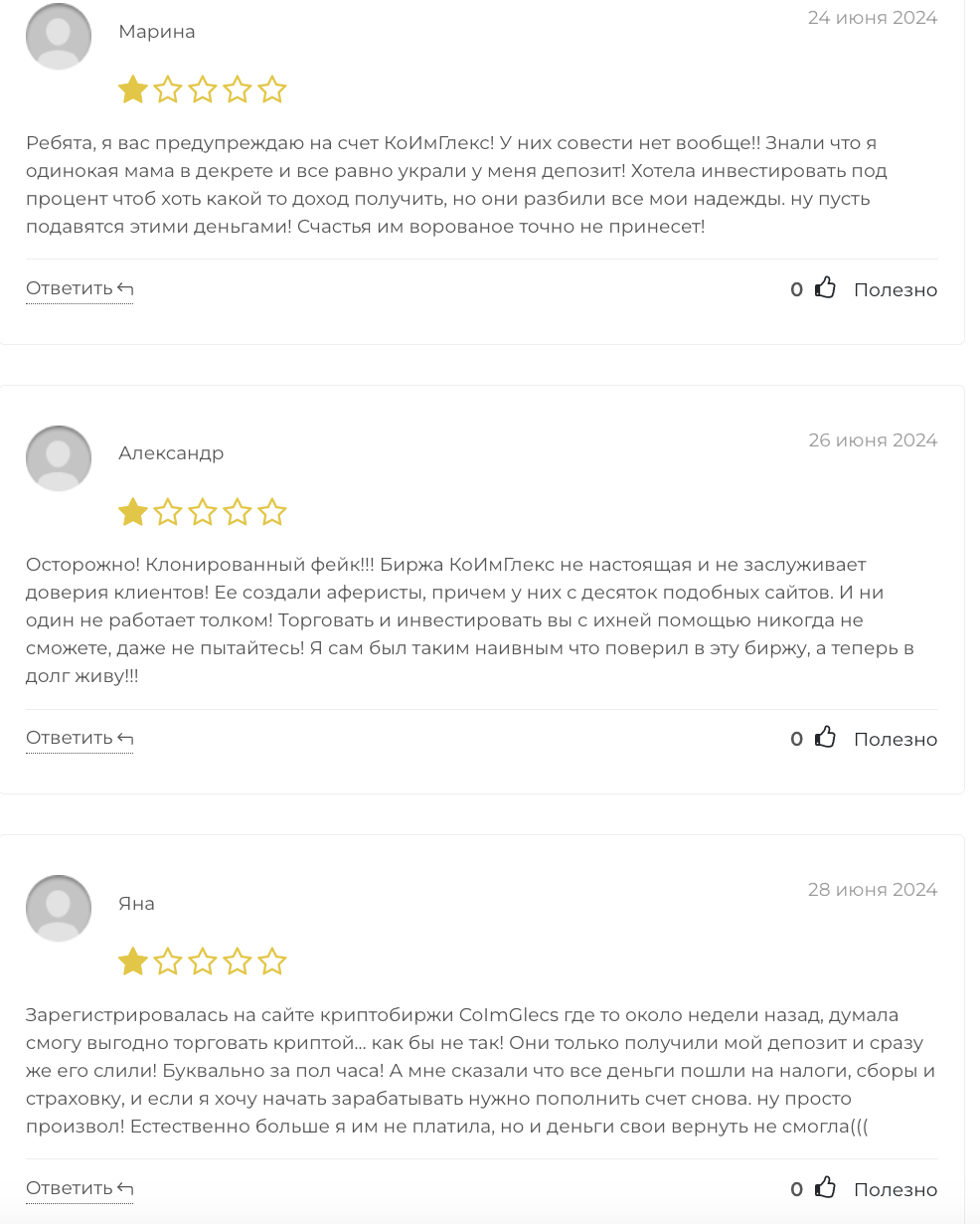 Инвесторы сообщают, что вывести деньги с «КоИмГлекс» очень сложно. Обработка запросов длится месяцами. Служба поддержки либо не отвечает, либо пишет стандартные фразы.