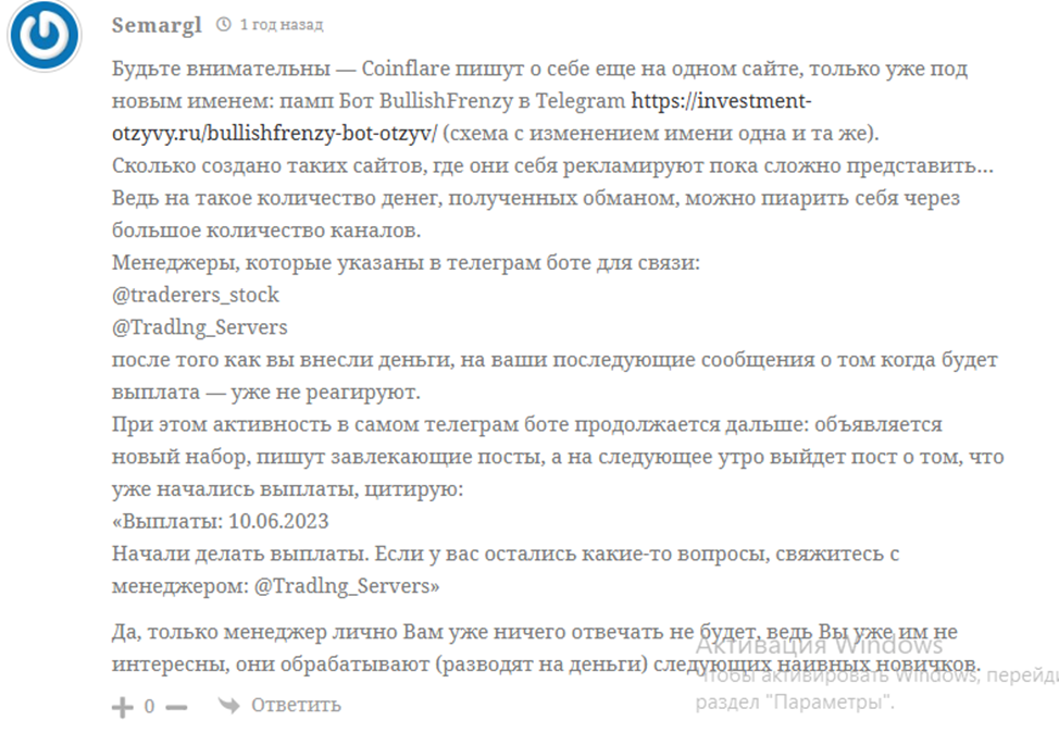 В чате ТГ канала Coinflare Global можно найти восторженные отзывы от довольных пользователей. В других группах сообщества комментарии закрыты, поэтому мы не можем проверить настоящие они или подделка. На независимых сайтах удалось отыскать несколько негативных отзывов о работе платформы. Клиенты жалуются на обманные действия сотрудников.