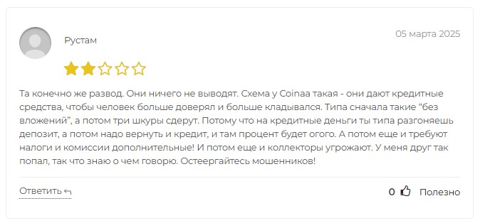 Сайт является очередным клоном мошенников, создавших лохотроны coina pro, coinas biz и другие. У него полностью идентичный дизайн и условия сотрудничества. Единственное отличие – в названии. При этом на апрель 2025 домену было всего 32 дня. А это не лучший показатель для репутации.