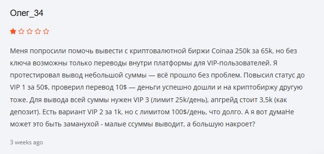 Что касается вывода прибыли, здесь начинается откровенное мошенничество. Чтобы забрать деньги, нужен ключ, который указывался при регистрации. Однако на практике он не подходит. Клиенты сообщают, что система требует оплатить дополнительные услуги. Также вывод невозможен без оформления VIP-статуса. А он, как несложно догадаться, платный.