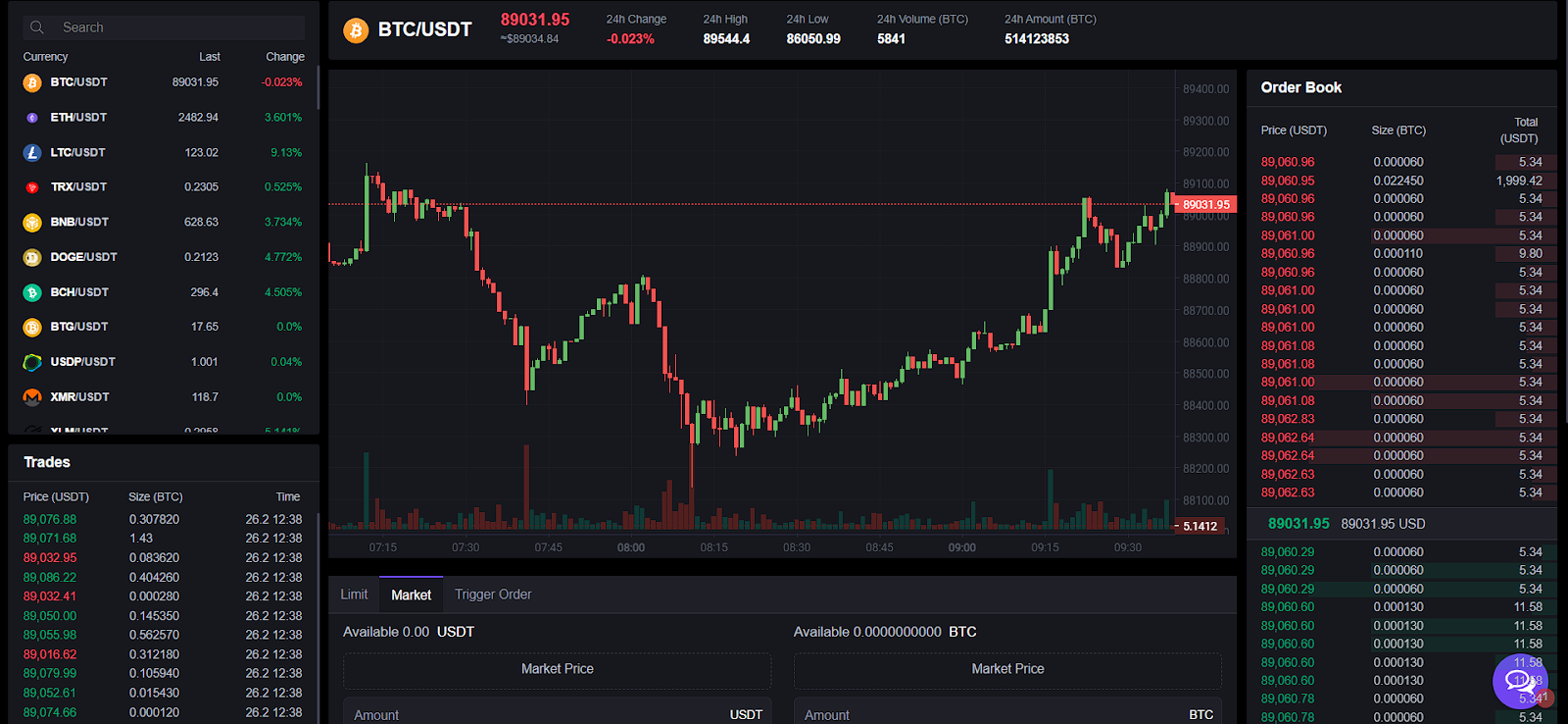 Здесь нет ничего интересного, перейдем к шапке сайта. Первая кнопка – «Спотовая торговля». Тут, как и на любой другой бирже, можно купить монеты по актуальной рыночной цене, посмотреть графики цены и проанализировать список ордеров.