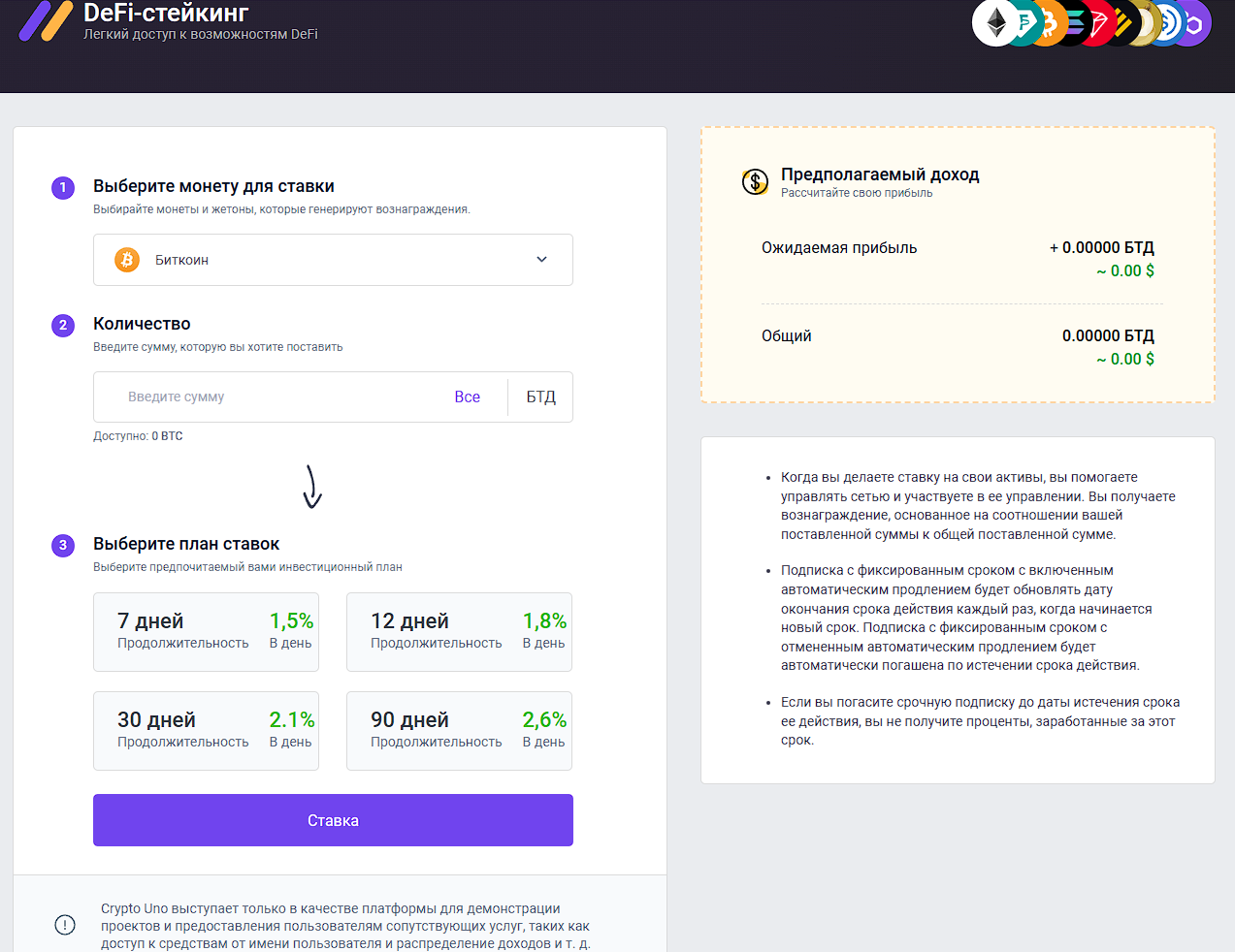 Раздел «Стейкинг» на Cryptouno Me позволяет пользователям замораживать свои криптоактивы на период от 7 до 90 дней, тем самым поддерживая работу сети. В обмен на это платформа предлагает вознаграждение, размер которого зависит от срока блокировки монет.