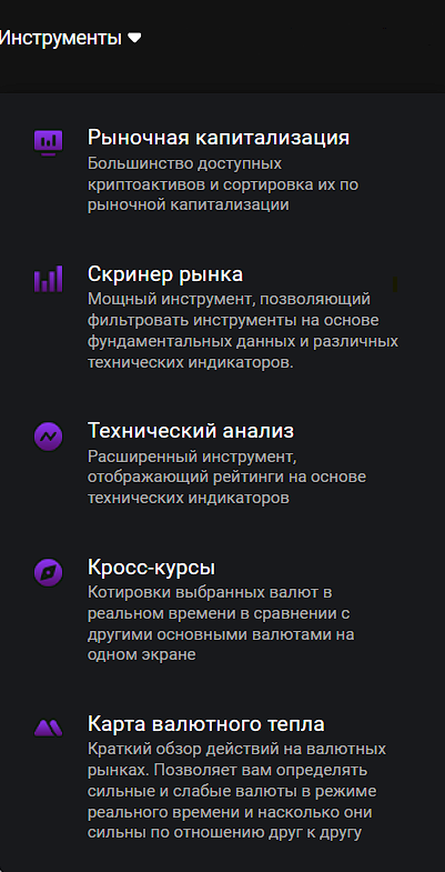 Биржа Cryptouno Me дает пользователям функции для удобного анализа рынка во вкладке «Инструменты»: