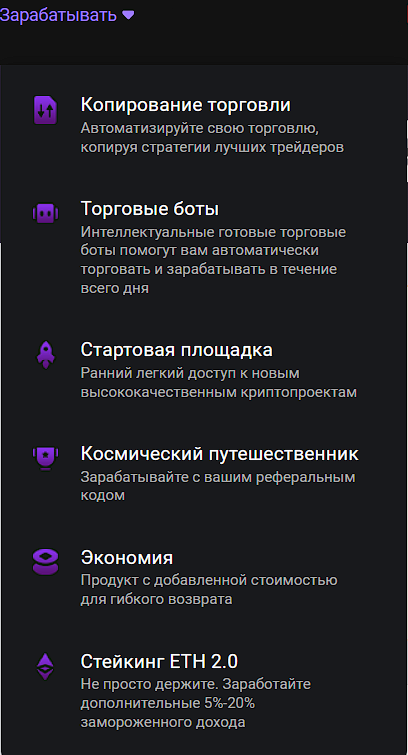 Раздел «Зарабатывать» включает в себя различные инструменты для получения прибыли: копитрейдинг, торговлю с ботами, покупку новых токенов на рынке, участие в реферальной программе, заморозку монет для выдачи кредитов и стейкинг ETH2.0.