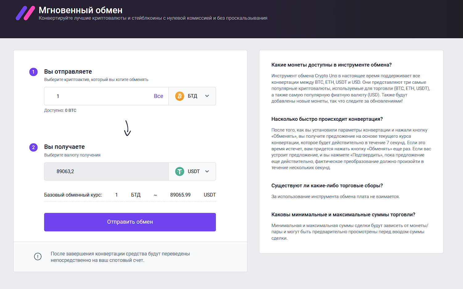 Перейдем к странице «Обмен». Биржа обещает быстро обменять токены не взимая никакой комиссии.