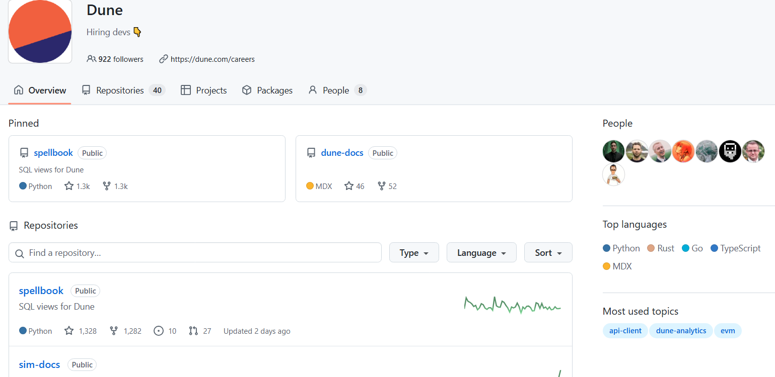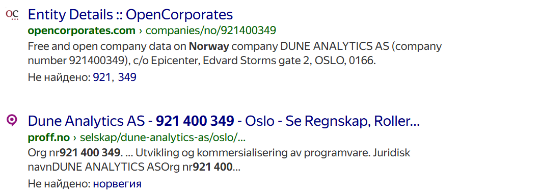 Одна из важнейших страниц известна под названием DuneAnalytics на GitHub. Здесь она имеет 922 подписчика и Dune дает документацию для настройки своих продуктов и крипты. Еще есть аккаунт Dune eth с 2 000 подписчиков на Warpcast, а также на Discord, где проект имеет около 40 000 участников, из которых около 2 500 находятся в сети.Так как место регистрации хоста не совпадало с указанным на сайте, мы проверили бизнес-регистрационный номер с помощью поиска. Выяснилось, что эти данные достоверные.