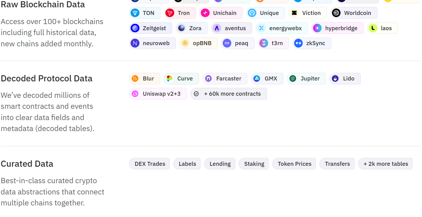 - еще одна система под названием Datashare подразделена на три рабочих блока. Анализатор токенов от Dune com Raw Blockchain Data даст доступ к более чем 100 блокчейнам, к историческим данным и будет добавлять новые цепи ежемесячно. Decoded Protocol Data декодирует миллионы смарт-контактов в метаданные, а Curated Data соединит несколько цепочек вместе;