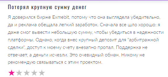 Отзывы о exmebit на русскоязычных форумах негативные. Мы проанализировали порядка 8 историй о попытках заработать с помощью этой криптовалютной биржи. Трейдеры рассказывают, что доступ к счету могут заблокировать без объяснения причин. Деньги с замороженных депозитов не возвращаются, а эксперты службы поддержки бездействуют.