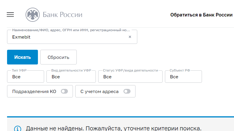 С юридической точки зрения криптовалютник Exmebit работает в серой зоне. У него нет ни одной лицензии от мировых регуляторов, следящих за деятельностью компаний финансового сектора. Например, по состоянию на 2 февраля 2025 года обменник не состоит в реестре Центрального Банк РФ. Россияне, сотрудничающие с компанией, не могут рассчитывать на помощь регулятора в случае нарушения условий со стороны exmebit com.