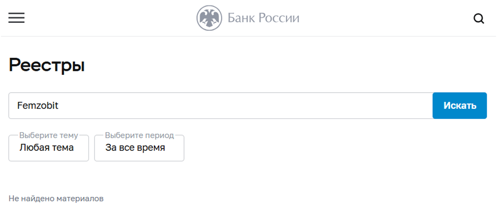 Возможно, админы сами удалили свой проект с просторов интернета, а, может, сервис получил блокировку из-за жалоб пользователей или нелегальной работы. Доказать, что проект работал вне правового поля, несложно – на сайте не было документов, а в реестре российского Центробанка о «Фемзобит» не указано ни слова.