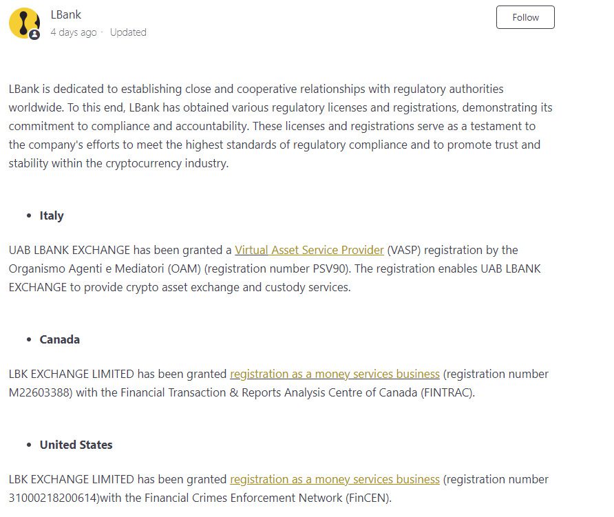 Сайт клонирован с топовых бирж, информация надергана хаотично, перевод выполнен коряво. Документов никаких нет, адреса указаны неверные, телефон отсутствует. Ни в одной из указанных стран компания не имеет статуса финансовой организации и лицензии. Ведут агрессивную рекламную компанию, но услуг не оказывают, банально присваивая деньги пользователей. Типичный мошенник, о котором уже много негативных отзывов. Сотрудничество с Lbank ведет к потере всего капитала, это скам проект.