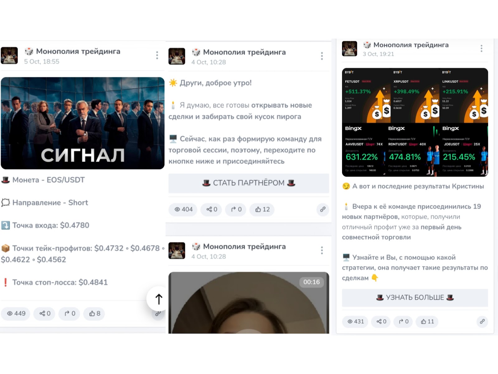 Сообщество закрытое, и когда пользователь отправляет заявку на вход, попадает к боту WelcomeMonopoly bot. Здесь информируют о закрытой группе и предлагают начать сотрудничество с создателями блога. В самом тг канале админы размещают краткие обзоры по крипторынку, рассуждают о разных токенах. Делятся стратегиями по получению прибыли на крипторынке. Одной из таких является интрадей-трейдинг. В постах расписано детальнее о принципах работы стратегии.Также аудитории предоставляют бесплатные сигналы. В них указывают направление, тейки и стоп-лоссы. Часто можно увидеть публикации с призывом начать сотрудничество. Также представлены отзывы о проекте Монополия Трейдинга и отчеты по торговле. Фактически всегда в таких публикациях указано, что участники закрытой группы получают большой доход. Стоит отметить, что верифицированной статистики нет. По такой причине реальная проходимость сигналов под сомнением.