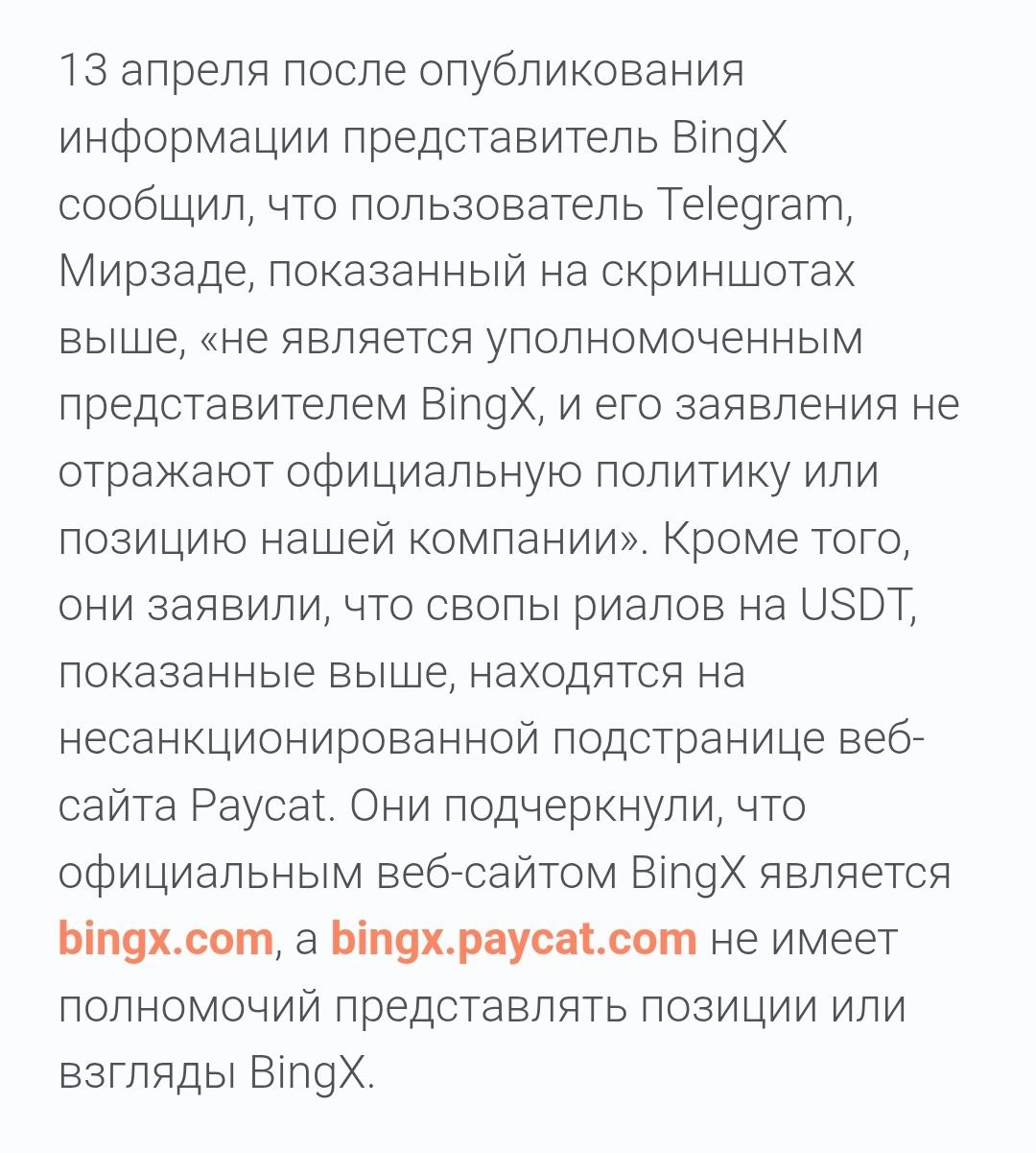 - «Официальный» партнёр BingX отрицает свою связь с проектом PayCat. Соответственно, это ставит под сомнение всю историю про «безопасные сделки под защитой биржи».