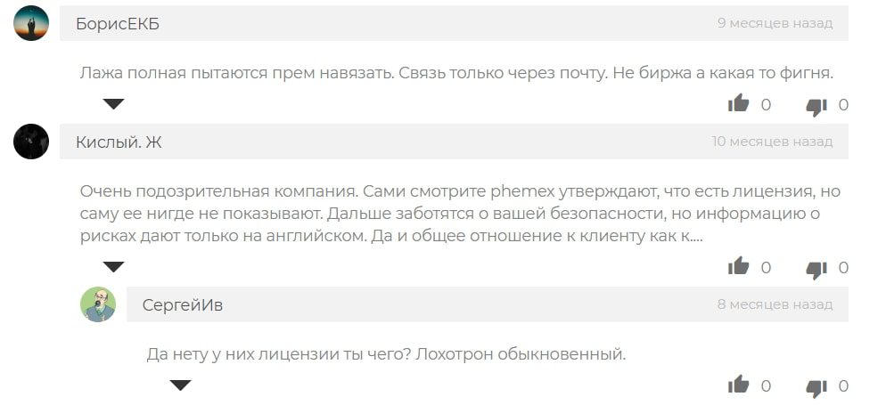 Комментариев о рассматриваемом проекте не так много, ведь он “жил” недолго и быстро соскамился. Обманутые клиенты просто не успели оставить негативные отзывы о Phemex Trade и предупредить потенциальных клиентов. При этом негативных мнений о самой бирже предостаточно. Но это не доказывает, что между проектами есть какая-то связь.