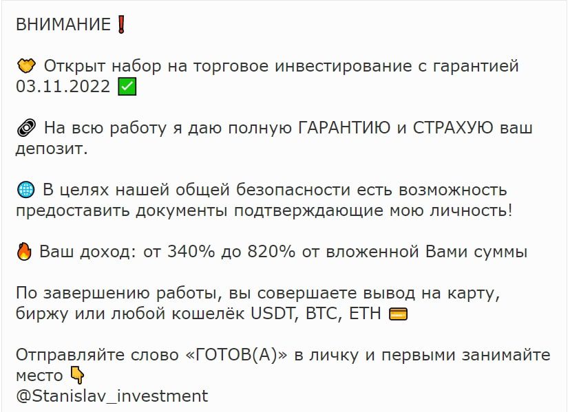 Иными словами, из инвестора буквально вытягивают деньги путем мошеннической схемы. Если человек идет на сделку и переводит указанную сумму, он все равно ничего не добивается. Отправленные деньги в полном объеме идут мошенникам. Сам человек, который начинает “качать права”, блокируется. Доказать что-либо не получится, ведь бот — всего лишь программа. Пользователи не знают, кто ее создал и является ответственным.
