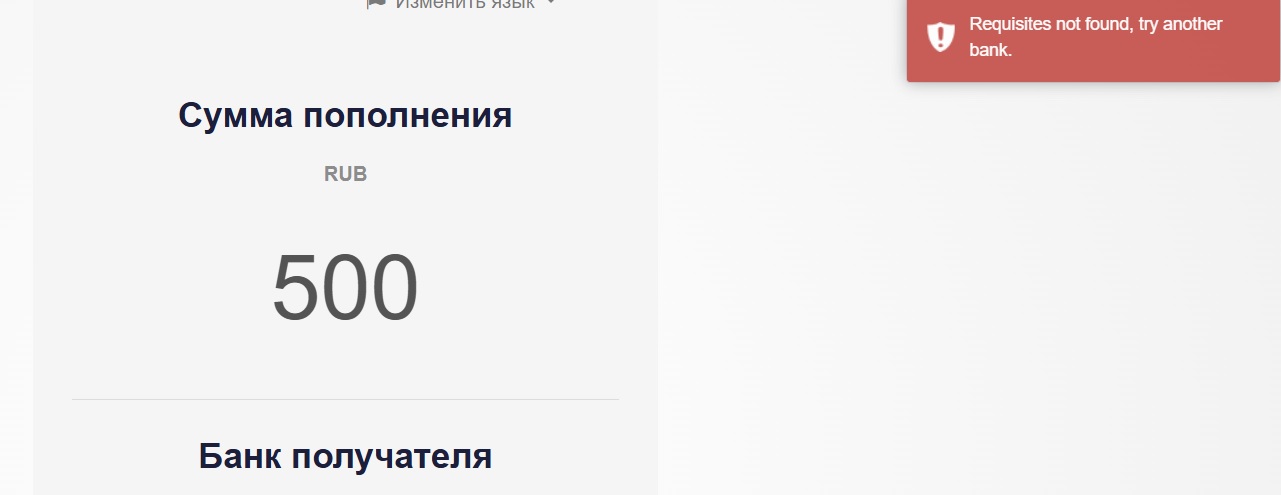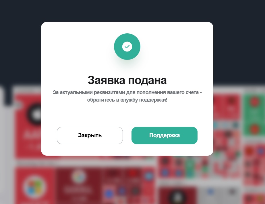 При выборе других платежных способов, когда нужно пополнить или вывести деньги, появляется всплывающее сообщение, где написано, что заявка подана, а для получения реквизитов нужно обратиться в поддержку.