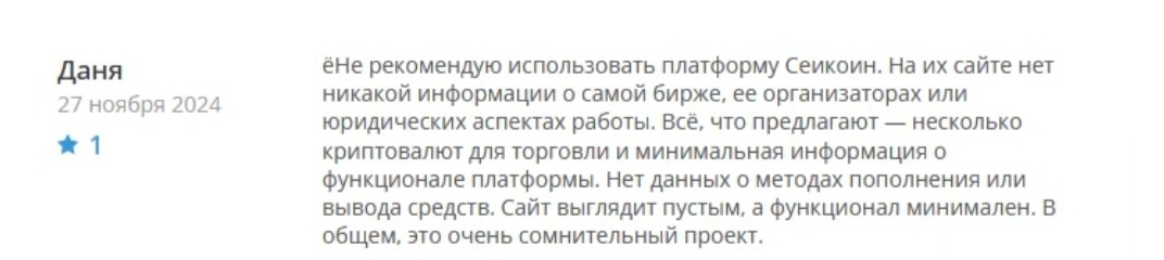 На самой площадке Seicoin.org отзывы не размещены. Владельцы не заморачиваются тем, чтобы привести платформу в презентабельный вид, ведь все равно проработает она не долго. А на сторонних ресурсах, отзывов не много, но те что есть — отрицательные. По всей видимости, мошенники не смогли обмануть большое количество людей.