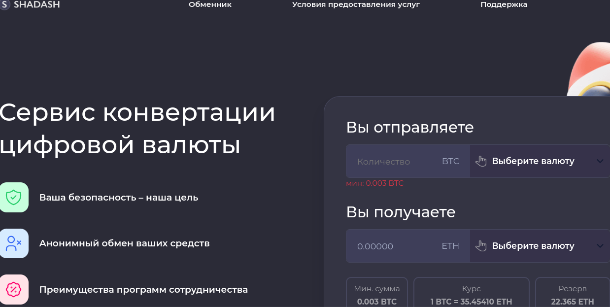 Shadash — цифровая платформа, которая предлагает розничным и опытным клиентам услуги по конвертации активов. Покупать и продавать можно криптовалюты и фиатные средства. Но стоит отметить, что функционала биржи у онлайн-ресурса нет. Речь о том, что пользователи не смогут торговать контрактами на разницу цен, расчетными фьючерсами и зарабатывать на стейкинге. У сервиса строго ограниченный функционал, почему профессиональные разработчики выбрали такую базовую систему — то, что нам предстоит выяснить.