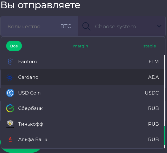 - Стейблкоины. Для обмена через онлайн-ресурс доступны Tether, USDC.