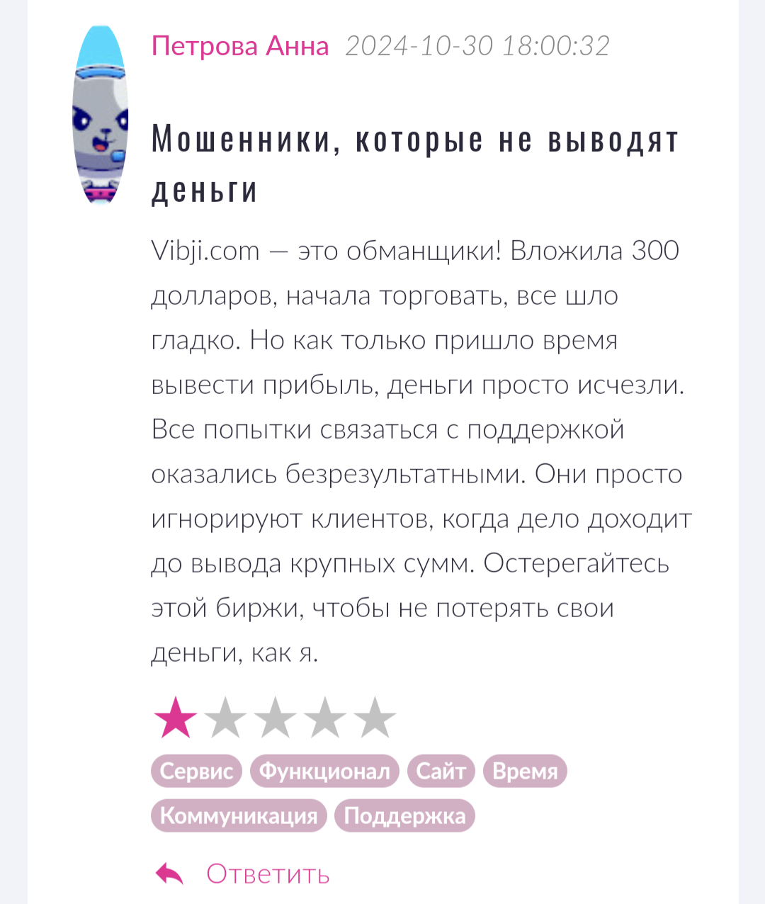 Во многих отзывах о Vibji можно заметить слова недовольных клиентов о том, что они даже не успели воспользоваться платформой, как их деньги пропали со счета, а техподдержка якобы ничего не смогла поделать с этой проблемой.