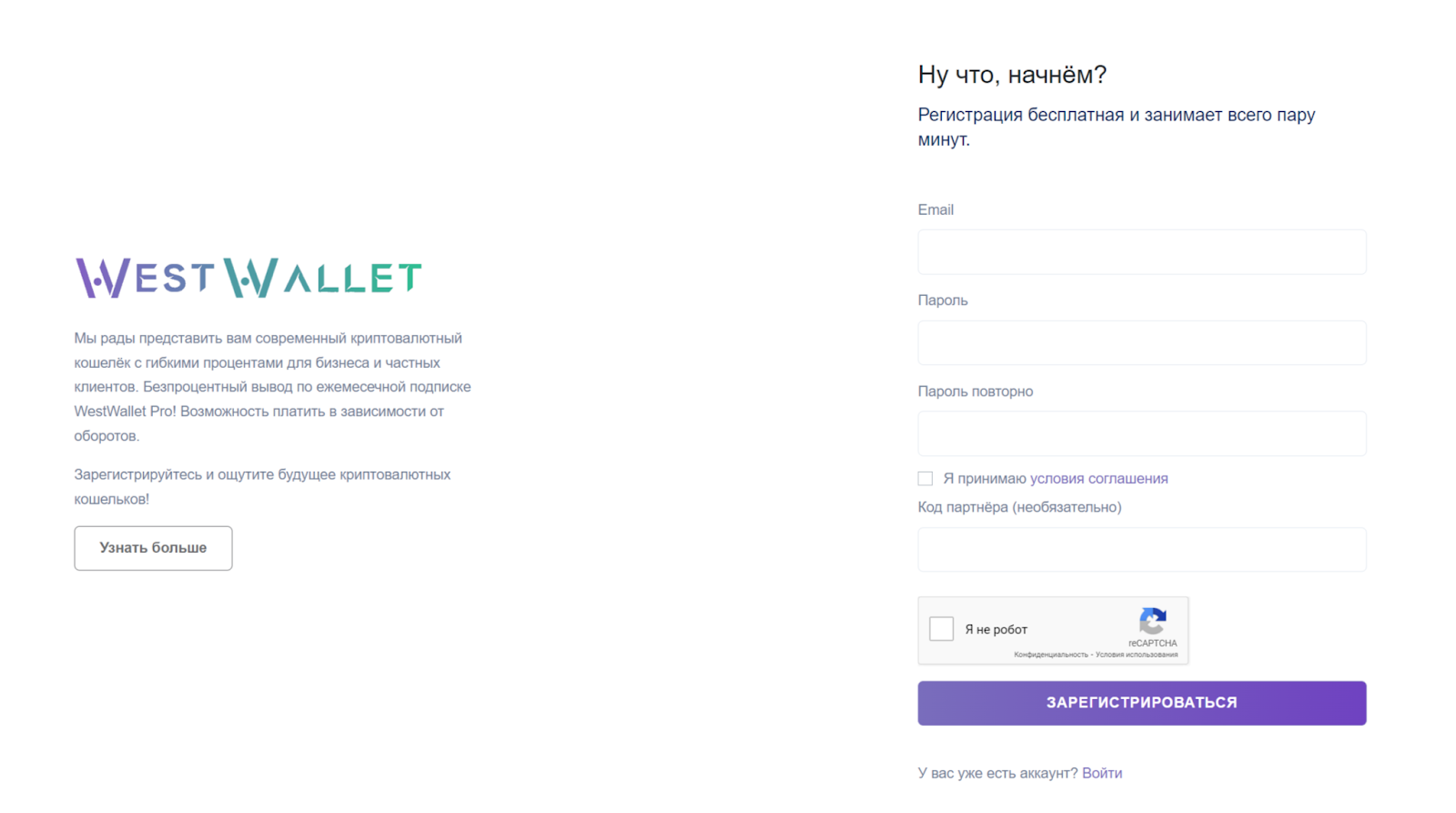 Для начала пользования кошельком WestWallet придется пройти регистрацию. Последняя требует внесения электронной почты и указание пароля дважды. После проведения этих манипуляций нужно перейти в email и подтвердить почтовый ящик. На следующем шаге можно авторизоваться и привязать сессию к IP.