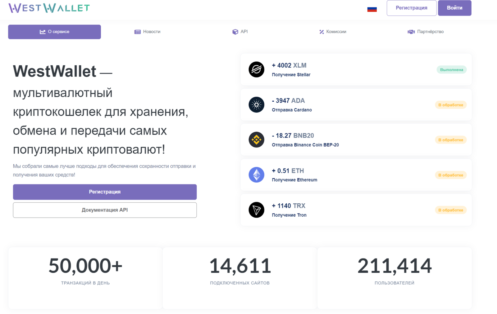 Сайт ВестВалет оформлен максимально шаблонно и без каких-то сложных элементов интерфейса. В описании говорится, что проект ориентирован на обмен и передачу популярной крипты. При этом платформа вышла на более чем 50 тыс. транзакций в сутки и имеет свыше 14.6 тыс. подключенных сайтов. При этом число пользователей перевалило через отметку в 211 тысяч.