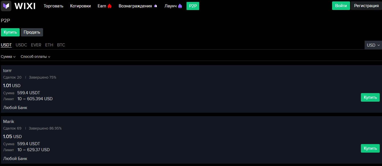 Есть у WIXI EXCHANGE Ru и свой P2P-сервис, доступный через отдельный раздел на странице с терминалом. Там можно обмениваться криптой напрямую с другими юзерами, а из фиата по умолчанию выставлен российских рубль (RUB).