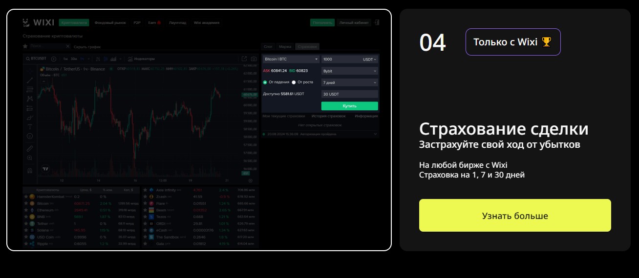 Торговать на WIXI EXCHANGE Global предлагают через встроенный веб-терминал. Безопасность сделок и честность условий (комиссии, плечо, скорость исполнения) на вполне достойном уровне. Мобильное приложение еще в разработке, так что заходить придется лишь со стационарного ПК или ноута. Главная фишка биржи – эксклюзивная услуга страхования, она подключается автоматом при открытии ордеров с любыми инструментами. Что это за страховка и как она работает – пока не очень ясно, но звучит интересно.