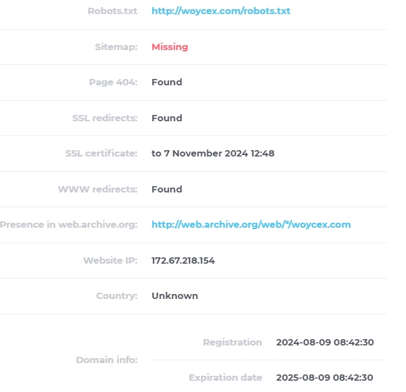 Домен официального сайта woycex com зарегистрирован 9 августа 2024 года – на момент обзора сервису около 2-х месяцев. По вопросам листинга можно обращаться на почту listing@woycex.com, по вопросам сотрудничества – partnership@woycex.com.