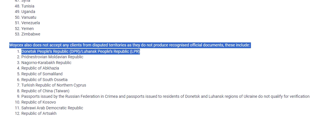 Отметим, что Woycex запретил доступ к своей площадке жителям ряда государств и территорий, в том числе крымчанам, жителям ЛНД и ДНР.