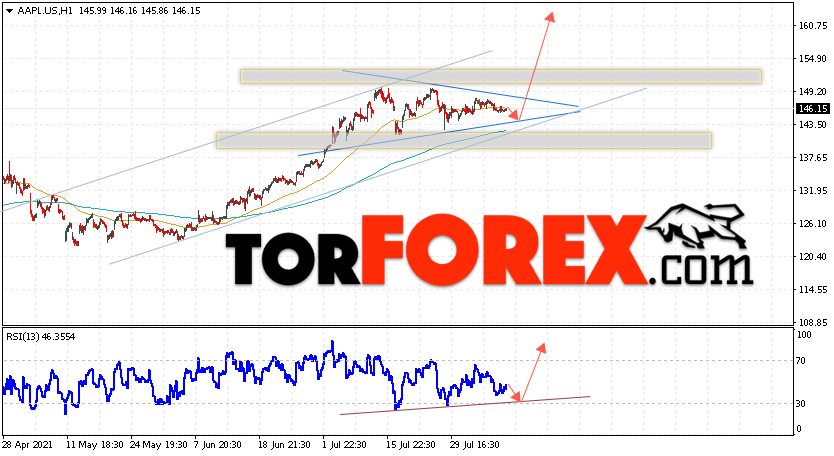 Дополнительным сигналом в пользу роста котировок Apple выступит тест линии поддержки на индикаторе относительной силы (RSI). Вторым сигналом станет отскок от нижней границы модели ”Треугольник”. Отменой варианта роста котировок стоимости акций компании Apple станет падение и пробой уровня 140.05. Это укажет на пробой нижней границы восходящего канала и продолжение падения в область на уровне 125.05. Ожидать ускорения роста стоит с пробоем области сопротивления и закрытием выше уровня 150.05, что укажет на пробой верхней границы модели ”Треугольник”.
