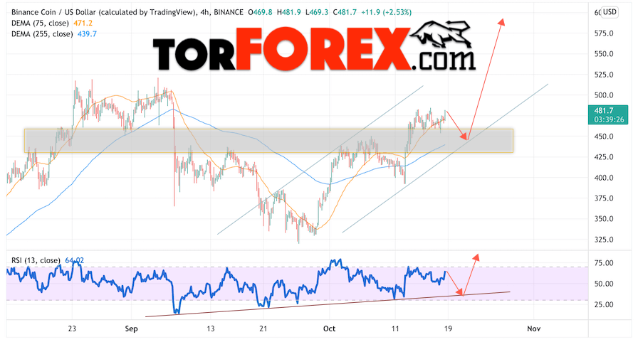 В пользу роста котировок BNB/USD выступит тест линии тренда на индикаторе относительной силы. Вторым сигналом станет отскок от нижней границы восходящего канала. Отменой варианта роста монеты станет падение стоимости актива и пробой области 420.05. Это укажет на пробой области поддержки и продолжение падения курса криптовалюты с потенциальной целью ниже уровня 320.05. С пробоем области сопротивления и закрытием котировок выше уровня 505.05 стоит ожидать подтверждения развития бычьей тенденции по Binance Coin.