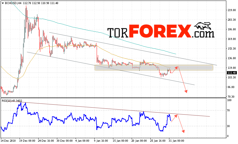 В пользу снижения котировок BCH/USD выступит тест нисходящей линии тренда на индикаторе относительной силы. А также отскок от уровня сопротивления. Отменой варианта падения курса Bitcoin Cash станет сильный рост и пробой области 140. Это укажет на пробой верхней границы канала и продолжения роста курса криптовалюты с целью ниже области 165. С пробоем области поддержки и закрытием котировок ниже уровня 100 стоит ожидать подтверждения развития нисходящей тенденции по Bitcoin Cash.