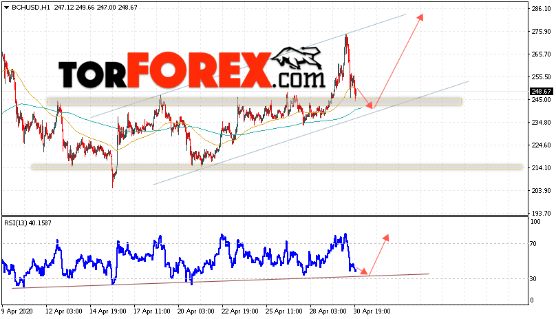 Дополнительным сигнальном в пользу подъёма котировок цифрового актива BCH/USD тест линии тренда на индикаторе относительной силы (RSI). Вторым сигналом в пользу роста котировок BCH/USD станет отскок от нижней границ восходящего канала. Отменой варианта подъёма курса криптовалюты Bitcoin Cash 1 мая 2020 года станет падение и пробой области 230.05. Это укажет на пробой области поддержки и продолжение падения курса криптовалюты с потенциальной целью ниже области 215.05. С пробоем области сопротивления и закрытием котировок выше уровня 265.05 стоит ожидать подтверждения развития восходящей тенденции по Bitcoin Cash.