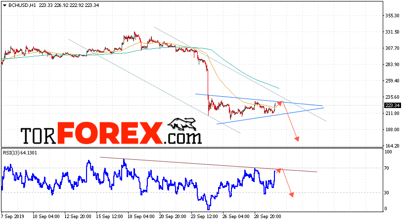 Дополнительным сигнальном в пользу падения котировок цифрового актива BCH/USD выступит тест нисходящей линии тренда на индикаторе относительной силы (RSI). Вторым сигналом в пользу снижения котировок BCH/USD станет отскок от верхней границы модели «Треугольник». Отменой варианта падения курса криптовалюты Bitcoin Cash 1 октября 2019 года станет сильный рост и пробой области 260.05. Это укажет на пробой верхней границы модели «Треугольник» и продолжение роста курса криптовалюты с потенциальной целью выше области 305.55. С пробоем области поддержки и закрытием котировок ниже уровня 190.05 стоит ожидать подтверждения развития нисходящей тенденции по Bitcoin Cash.
