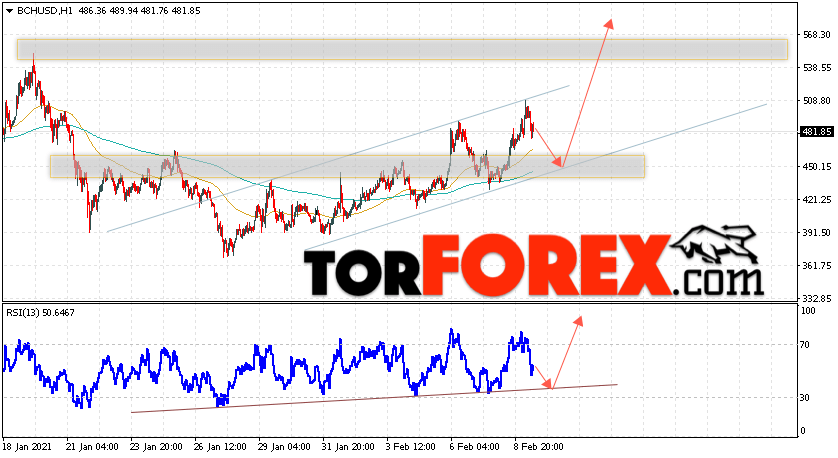 Дополнительным сигнальном в пользу роста котировок цифрового актива BCH/USD тест линии тренда на индикаторе относительной силы (RSI). Вторым сигналом в пользу подъёма котировок BCH/USD станет отскок от нижней границы восходящего канала. Отменой варианта роста курса криптовалюты Bitcoin Cash 8 февраля 2021 года станет падение и пробой области 415.05. Это укажет на пробой области поддержки и продолжение падения курса криптовалюты с потенциальной целью ниже области 375.05. С пробоем области сопротивления и закрытием котировок выше уровня 525.05 стоит ожидать подтверждения развития восходящей тенденции по Bitcoin Cash.