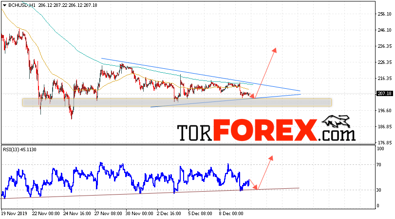 Дополнительным сигнальном в пользу роста котировок цифрового актива BCH/USD тест восходящей линии тренда на индикаторе относительной силы (RSI). Вторым сигналом в пользу подъёма котировок BCH/USD станет отскок от нижней границы нисходящего канала. Отменой варианта роста курса криптовалюты Bitcoin Cash 11 декабря 2019 года станет падение и пробой области 190.05. Это укажет на пробой нижней границы нисходящего канала и продолжение падения курса криптовалюты с потенциальной целью ниже области 165.05. С пробоем области сопротивления и закрытием котировок выше уровня 225.05 стоит ожидать подтверждения развития восходящей тенденции по Bitcoin Cash и начала отработки модели «Треугольник».