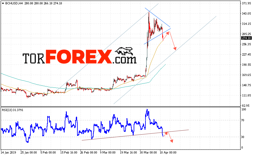 Таким образом, Bitcoin Cash прогноз и аналитика на 12 апреля 2019 предполагает попытку теста области сопротивления вблизи уровня 290. Откуда стоит ожидать отскок и продолжения падения BCH/USD в область ниже уровня 235. Дополнительным сигналом в пользу падения Bitcoin Cash выступит тест линии тренда на индикаторе относительной силы. Отменой варианта падения станет сильный рост и пробой области 315. Это укажет на продолжение роста криптовалюты с потенциальной целью выше уровня 370.