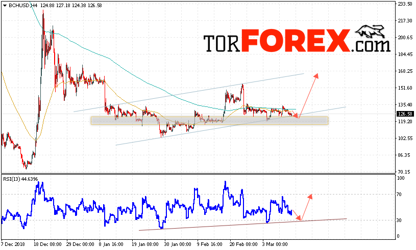 В пользу подъёма котировок BCH/USD выступит тест восходящей линии тренда на индикаторе относительной силы. Вторым сигналом станет отскок от нижней границы восходящего канала. Отменой варианта роста курса Bitcoin Cash станет падение и пробой области 115. Это укажет на пробой области поддержки и продолжения падения курса криптовалюты с целью ниже области 100. С пробоем области сопротивления и закрытием котировок выше уровня 135 стоит ожидать подтверждения развития восходящей тенденции по Bitcoin Cash.
