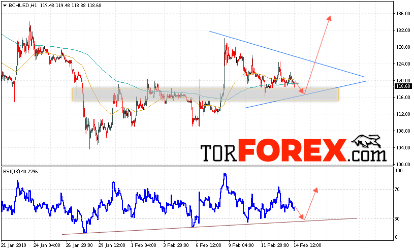 В пользу подъёма котировок BCH/USD выступит тест восходящей линии тренда на индикаторе относительной силы. А также отскок от нижней границы модели «Треугольник». Отменой варианта роста курса Bitcoin Cash станет падение и пробой области 112. Это укажет на пробой нижней границы модели и продолжения падения курса криптовалюты с целью ниже области 100. С пробоем области сопротивления и закрытием котировок выше уровня 125 стоит ожидать подтверждения развития восходящей тенденции по Bitcoin Cash.
