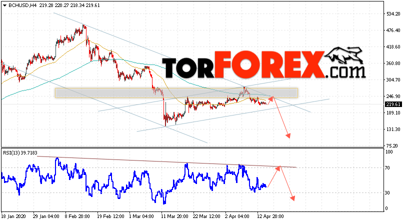 Дополнительным сигнальном в пользу падения котировок цифрового актива BCH/USD тест линии тренда на индикаторе относительной силы (RSI). Вторым сигналом в пользу падения котировок BCH/USD станет отскок от верхней границы нисходящего канала. Отменой варианта падения курса криптовалюты Bitcoin Cash 16 апреля 2020 года станет сильный рост и пробой области 300.55. Это укажет на пробой области сопротивления и продолжение роста курса криптовалюты с потенциальной целью выше области 345.05. С пробоем области поддержки и закрытием котировок ниже уровня 185.05 стоит ожидать подтверждения развития нисходящей тенденции по Bitcoin Cash.