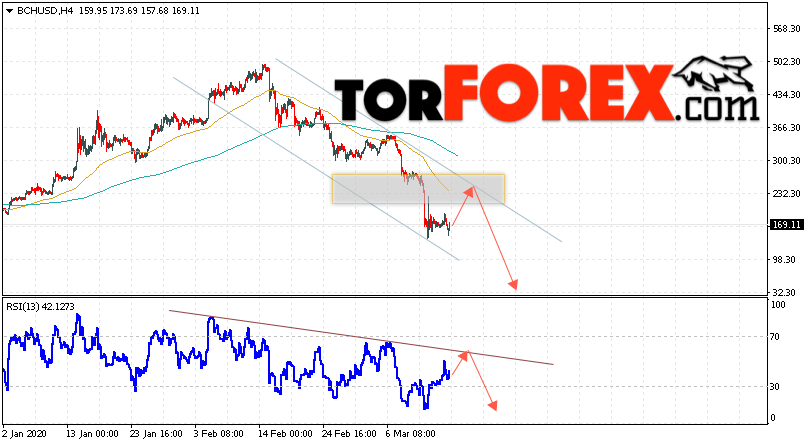 Дополнительным сигнальном в пользу падения котировок цифрового актива BCH/USD тест линии тренда на индикаторе относительной силы (RSI). Вторым сигналом в пользу падения котировок BCH/USD станет отскок от верхней границы нисходящего канала. Отменой варианта падения курса криптовалюты Bitcoin Cash 17 марта 2020 года станет сильный рост и пробой области 275.05. Это укажет на пробой области сопротивления и продолжение роста курса криптовалюты с потенциальной целью выше области 355.05. С пробоем области поддержки и закрытием котировок ниже уровня 115.05 стоит ожидать подтверждения развития нисходящей тенденции по Bitcoin Cash.