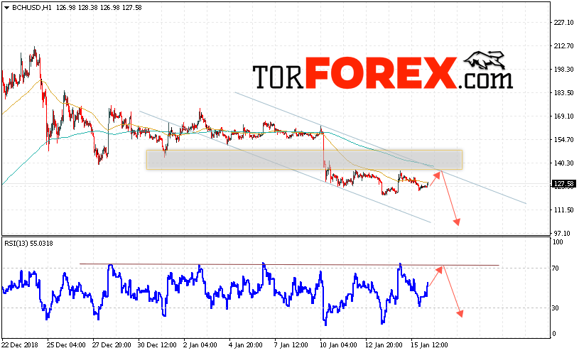 В пользу падения котировок BCH/USD выступит тест нисходящей линии тренда на индикаторе относительной силы. А также отскок от верхней границы нисходящего канала. Отменой варианта падения курса Bitcoin Cash станет сильный рост и пробой области 150. Это укажет на пробой верхней границы канала и продолжения роста курса криптовалюты с целью выше области 190. С пробоем области поддержки и закрытием котировок ниже уровня 115 стоит ожидать подтверждения развития нисходящей тенденции по Bitcoin Cash.