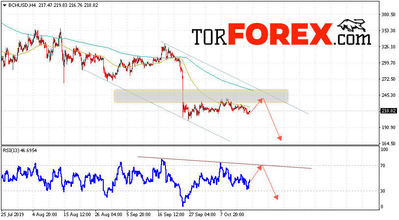 Дополнительным сигнальном в пользу падения котировок цифрового актива BCH/USD выступит тест нисходящей линии тренда на индикаторе относительной силы (RSI). Вторым сигналом в пользу падения котировок BCH/USD станет отскок от верхней границы нисходящего канала. Отменой варианта падения курса криптовалюты Bitcoin Cash 18 октября 2019 года станет сильный рост и пробой области 260.05. Это укажет на пробой верхней границы нисходящего канала и продолжение роста курса криптовалюты с потенциальной целью выше области 305.05. С пробоем области поддержки и закрытием котировок ниже уровня 205.05 стоит ожидать подтверждения развития нисходящей тенденции по Bitcoin Cash.