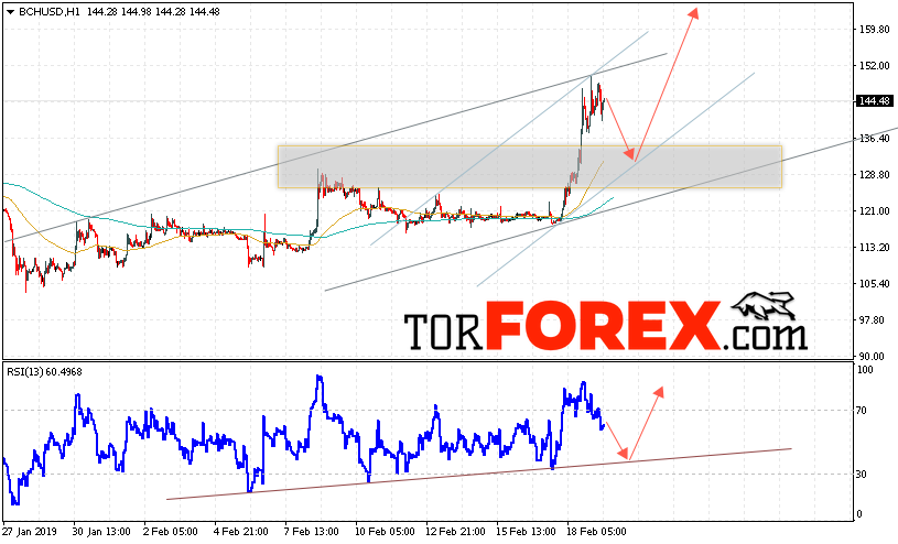 В пользу подъёма котировок BCH/USD выступит тест восходящей линии тренда на индикаторе относительной силы. А также отскок от нижней границы восходящего канала. Отменой варианта роста курса Bitcoin Cash станет падение и пробой области 120. Это укажет на пробой нижней границы восходящего канала и продолжения падения курса криптовалюты с целью ниже области 105. С пробоем области сопротивления и закрытием котировок выше уровня 150 стоит ожидать подтверждения развития восходящей тенденции по Bitcoin Cash.