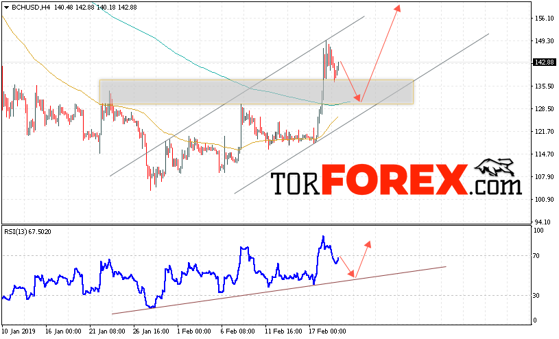 В пользу подъёма котировок BCH/USD выступит тест восходящей линии тренда на индикаторе относительной силы. А также отскок от нижней границы восходящего канала. Отменой варианта роста курса Bitcoin Cash станет падение и пробой области 120. Это укажет на пробой нижней границы восходящего канала и продолжения падения курса криптовалюты с целью ниже области 105. С пробоем области сопротивления и закрытием котировок выше уровня 150 стоит ожидать подтверждения развития восходящей тенденции по Bitcoin Cash.