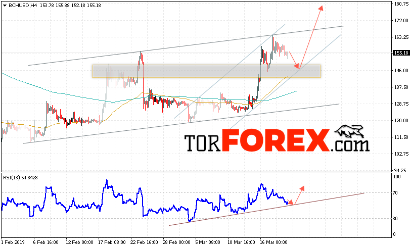 В пользу подъёма котировок BCH/USD выступит тест восходящей линии тренда на индикаторе относительной силы. Вторым сигналом станет отскок от нижней границы восходящего канала. Отменой варианта роста курса Bitcoin Cash станет падение и пробой области 140. Это укажет на пробой нижнем границы канала и продолжения падения курса криптовалюты с целью ниже области 120. С пробоем области сопротивления и закрытием котировок выше уровня 165 стоит ожидать подтверждения развития восходящей тенденции по Bitcoin Cash.