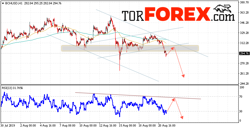 Дополнительным сигнальном в пользу снижения котировок BCH/USD выступит тест нисходящей линии тренда на индикаторе относительной силы. Вторым сигналом в пользу падения котировок BCH/USD станет отскок от верхней границы нисходящего канала. Отменой варианта падения курса криптовалюты Bitcoin Cash 22 августа 2019 года станет сильный рост и пробой области 325.00. Это укажет на пробой области сопротивления и продолжение роста курса криптовалюты с потенциальной целью выше области 405.00. С пробоем области поддержки и закрытием котировок ниже уровня 265.00 стоит ожидать подтверждения развития нисходящей тенденции по Bitcoin Cash.