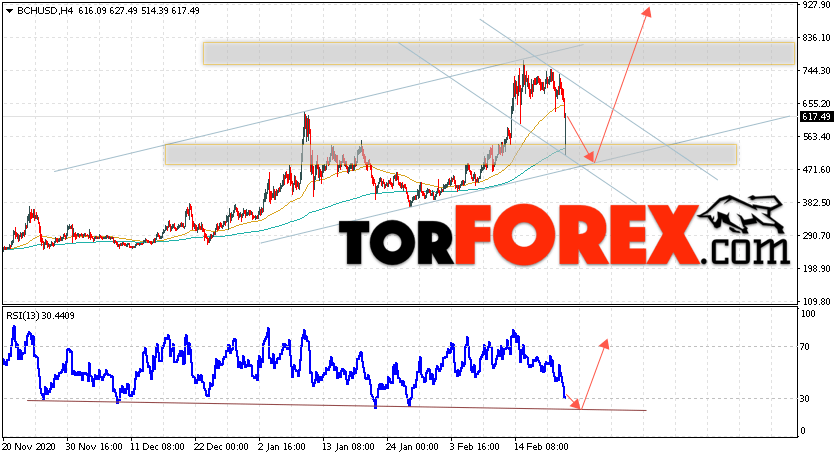 Дополнительным сигнальном в пользу роста котировок цифрового актива BCH/USD тест линии тренда на индикаторе относительной силы (RSI). Вторым сигналом в пользу подъёма котировок BCH/USD станет отскок от нижней границы восходящего канала. Отменой варианта роста курса криптовалюты Bitcoin Cash 23 февраля 2021 года станет падение и пробой области 405.05. Это укажет на пробой области поддержки и продолжение падения курса криптовалюты с потенциальной целью ниже области 195.05. С пробоем области сопротивления и закрытием котировок выше уровня 705.05 стоит ожидать подтверждения развития восходящей тенденции по Bitcoin Cash.