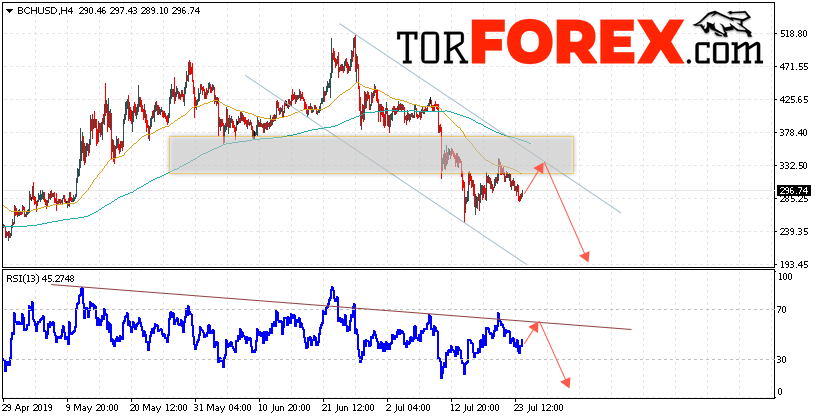 Дополнительным сигнальном в пользу падения котировок BCH/USD выступит тест нисходящей линии сопротивления на индикаторе относительной силы. Вторым сигналом в пользу снижения котировок BCH/USD станет отскок от верхней границы нисходящего канала. Отменой варианта падения курса криптовалюты Bitcoin Cash станет сильный рост и пробой области 375.00. Это укажет на пробой области сопротивления и продолжение роста курса криптовалюты с потенциальной целью выше области 415.00. С пробоем области поддержки и закрытием котировок ниже уровня 240.00 стоит ожидать ускорения развития нисходящей тенденции по Bitcoin Cash.
